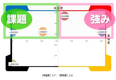 個人の「3~5年後に実現していたい項目(希望度)」×「達成できていると認識している項目(実現度)」をマトリクス「4eyes® Windows」で可視化します。「希望度が高く、かつ実現度も高い項目」が個人キャリアの強みとなり、「希望度は高いが、実現度が低い項目」が課題となります。